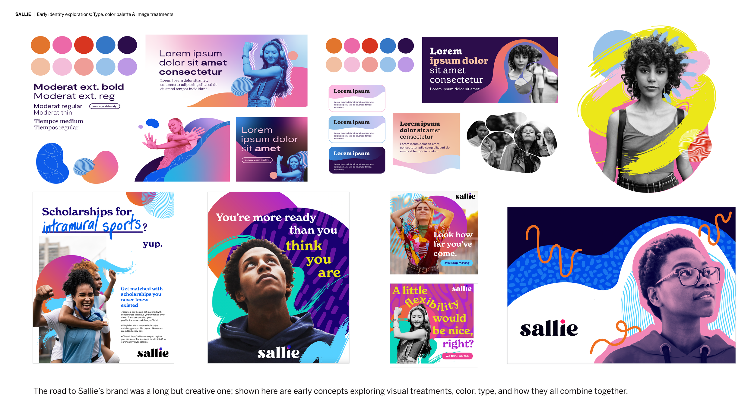 Starting in 2022, I had the incredible opportunity to help tackle creating an entirely new brand for Sallie Mae—called Sallie—from scratch. Sallie is the fledgling education services arm of our business which aims to be a helpful, no-nonsense source for all things planning for college. It was very important that Sallie’s visual identity was equal parts friendly and compassionate, while also feeling solid, grounded and trustworthy.
